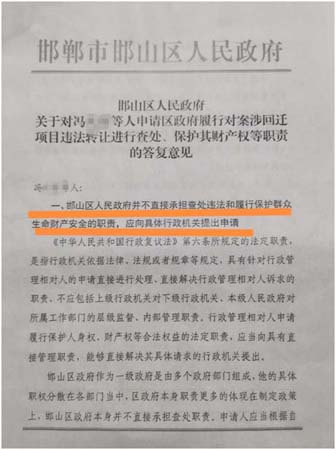 2024年9月26日,邯山区政府就冯某等人申请区政府履行对案涉回迁项目违法转让进行查处、保护其财产权等职责的答复意见中第一条竟称:邯山区政府并不直接承担查处违法和履行保护群众生命财产安全的职责,应向具体行政机关提出申请;第二条认为:区政府组建专案组并被法院指定为管理人,已实际履行了相应职责,没有发现申请人所反映的重大违法现象。