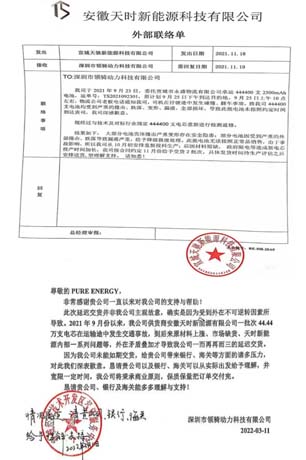 2020年经过圈内朋友介绍认识,后经过实地考察以及背景调查了解到,位于安徽宣城的安徽天时新能源科技有限公司注册资本1个亿,宣城市财政局通过宣城市通达创投科技有限公司投资3000万元,占股30%。当年开始建立合作,之前基本都是签订单批次合同且基本按时交货了。