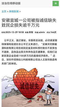 公平正义,国之基址。全面依法治国,必须紧紧围绕保障和促进社会公平正义来进行。“安徽天时新能源科技有限公司在收到定金及材料预付款后不发货也不退款,且伪造出货文件并伪造交通事故,给我们这家民营企业造成1100多万元的直接经济损失。”近日,深圳市领骑动力科技有限公司法人王某玲致函有关部门反映说。