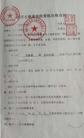 2020年11月,我们赵沟村村民通过村委会,以流转的方式,将土地的承包经营权,统一对外出租给了郑州国富农牧专业合作社。随后,经过村委会的同意,郑州国富农牧专业合作社又将流转的土地转租给了注册地位于郑州市金水区的河南信基物流有限公司,租金为每年1000元/亩。但从2020年起,至今已累计拖欠5年的租金。
